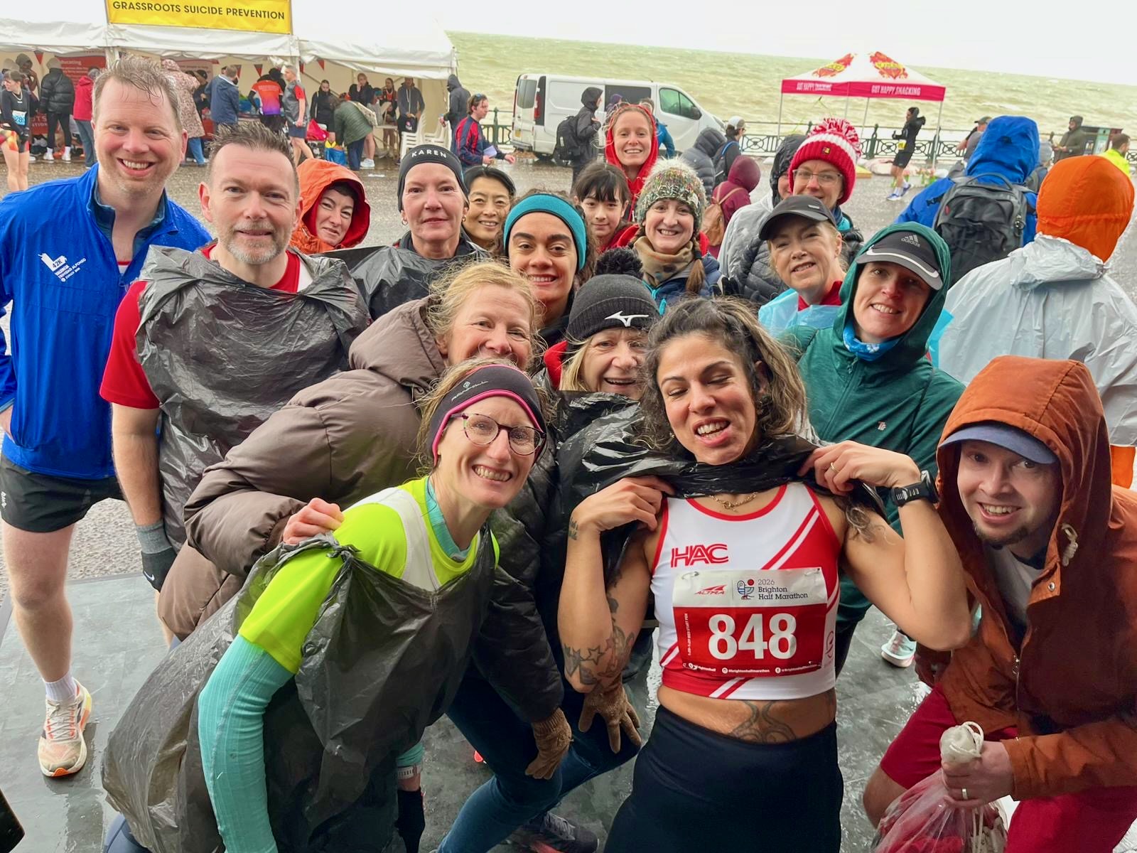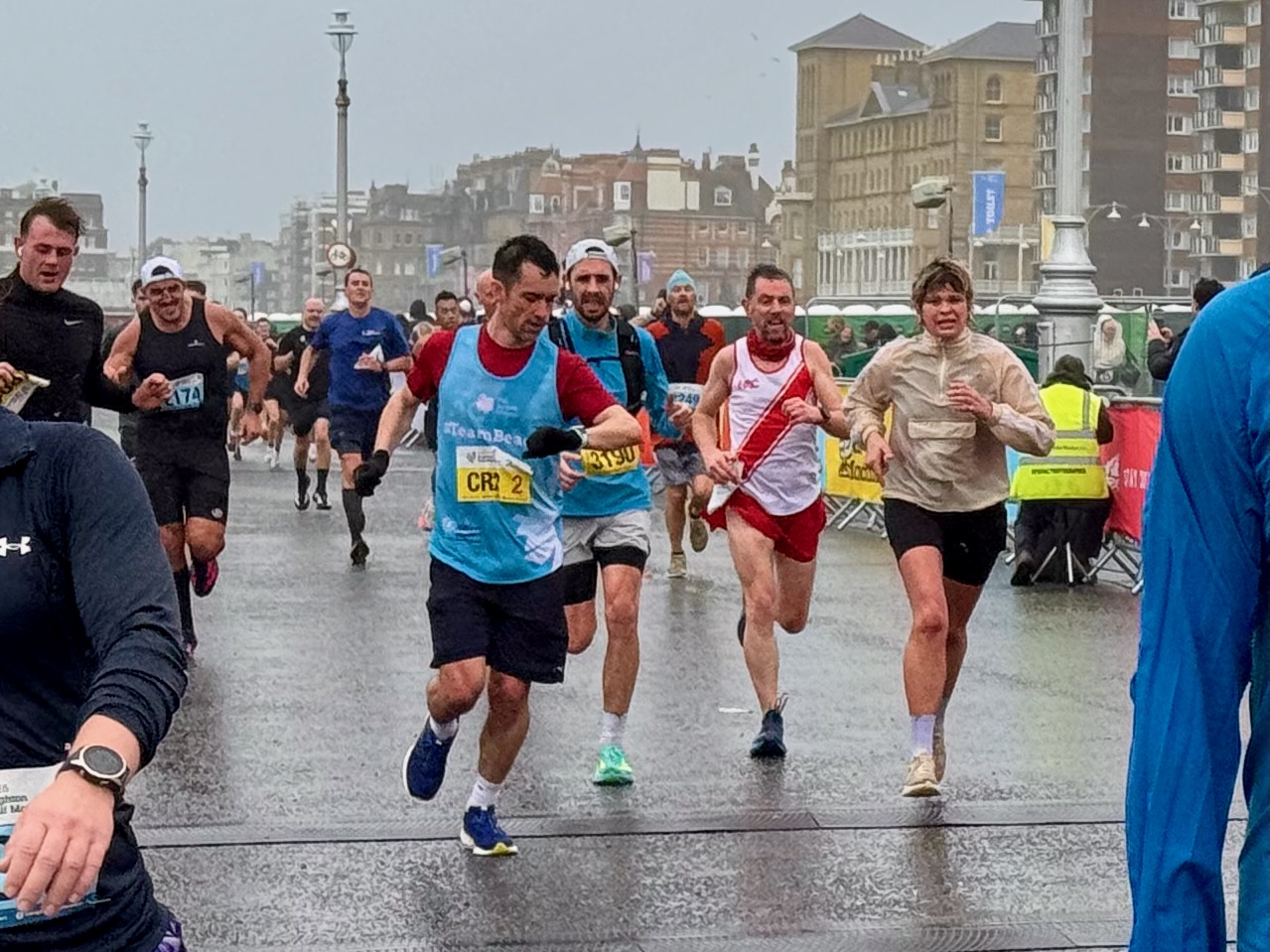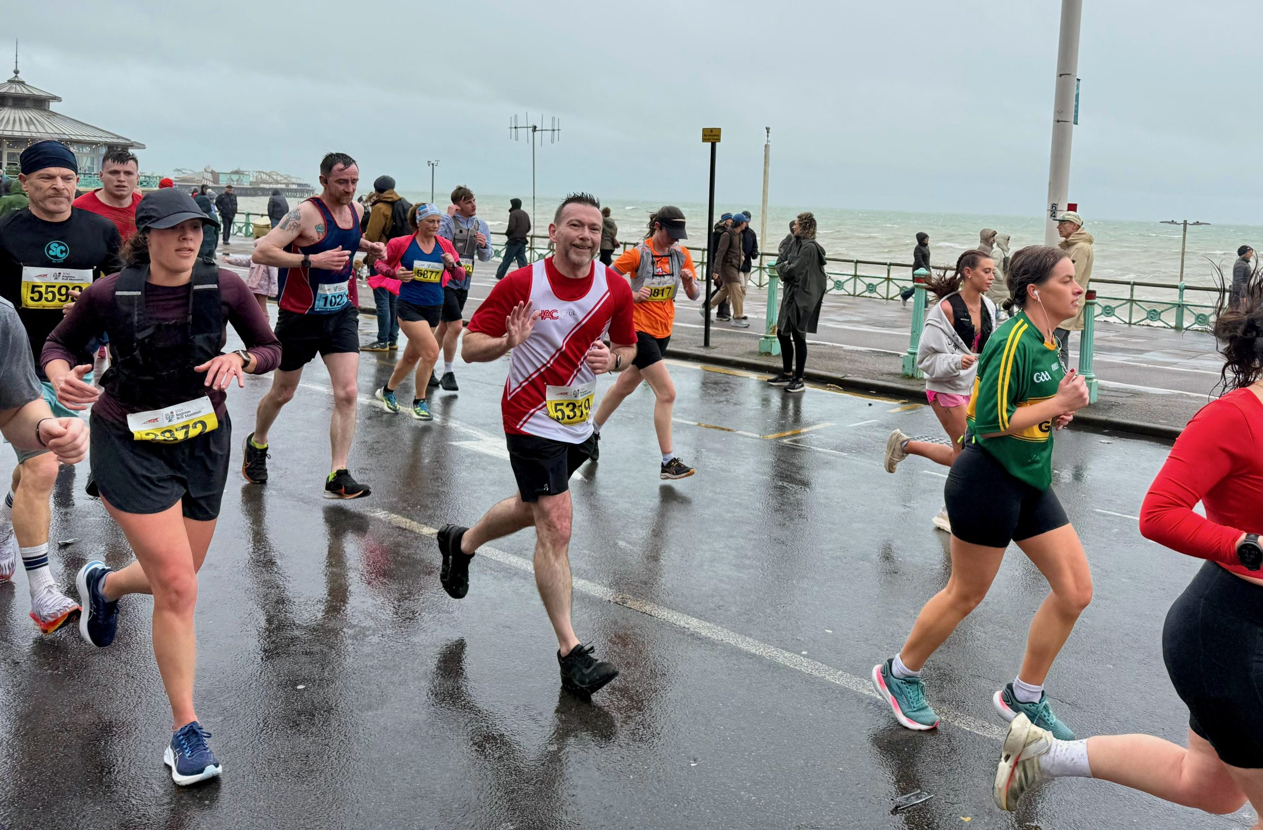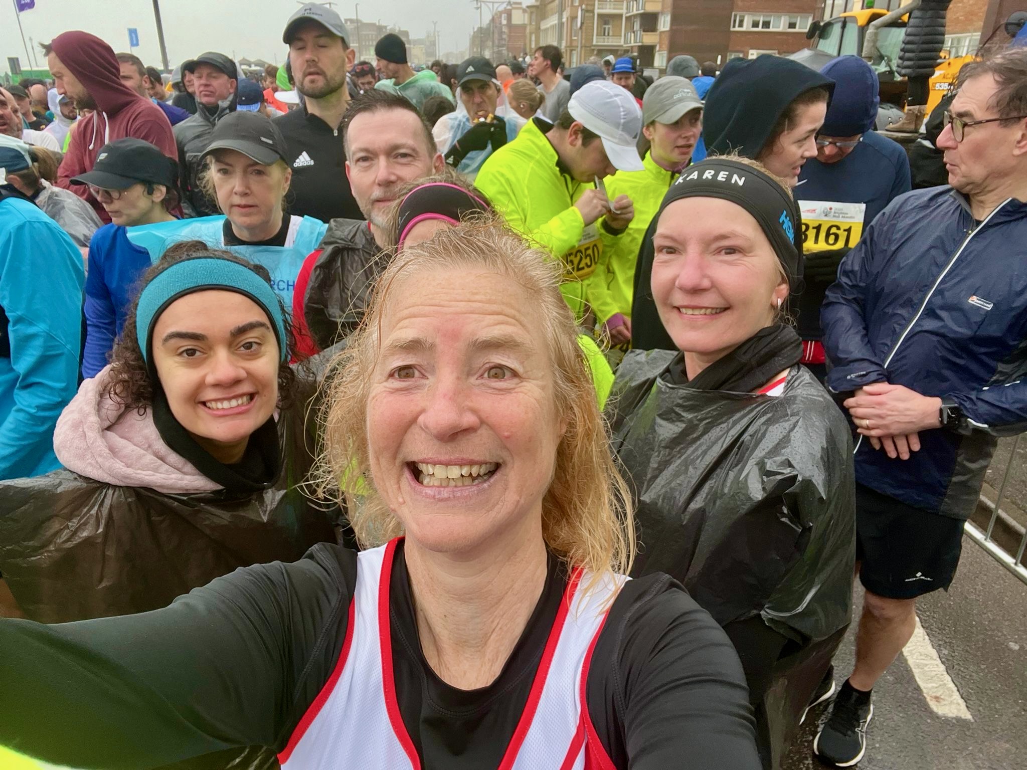 In the starting pen: “Come to Brighton” Spencer said, “…it will be fun he said”. I contemplated my life choices in the starting pen, listening to the bin bags fluttering and teeth chattering of my fellow HAC runners. Kathy was either visualising her run or considering her options after killing Karen for making her sign up. Karen and Chloe were energetic and enthusiastic, ready to run, while Paul, Lynn, and I braced ourselves for the 13.1 miles ahead in wind and rain.